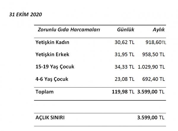 Sağlık Bakanlığına bağlı Yataklı Tedavi Kurumları Dairesi’nden alınan, 4 kişilik bir ailenin sağlıklı bir biçimde beslenmesi için gerekli olan beslenme kalıbı ve bu kalıptaki maddelerin İstatistik Kurumu’nca açıklanan fiyatlarının ortalamaları alınarak hazırlanan rapora göre, 4 kişilik bir aile için açlık sınırı 3 bin 599 TL olarak hesaplandı.