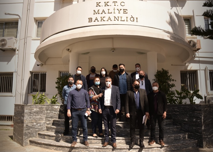 Kıbrıs Türk Amme Memurları Sendikası (KTAMS), Kıbrıs Türk Kamu Görevlileri Sendikası (KAMUSEN), Kamu İşçileri Sendikası (KAMU-İŞ), Gümrük Çalışanları Sendikası (GÜÇ-SEN), Hemşire ve Ebeler Sendikası (KTHES) ve Gelir ve Vergi Dairesi Çalışanları Sendikası (VERGİ-SEN) temsilcileri bugün saat 15.00 sıralarında yedi maddeden oluşan taleplerini Maliye Bakanı Dursun Oğuz’a iletmek üzere Maliye Bakanlığı’na geldi.