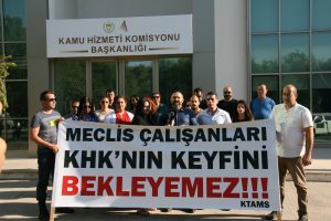 KHK önündeki basın açıklamasında, “Meclis Çalışanları KHK’nın Keyfini Bekleyemez” yazılı pankart açıldı.