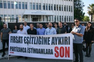 Sendika yetkilileri basın açıklamasında, “Fırsat Eşitliğine Aykırı Partizanca İstihdamlara Son” yazılı pankart açtı.