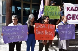 42 örgüt tarafından temsilciler düzeyinde yapılan eylemde, “Kadınlar gericiliği geçit vermiyor” pankartı açıldı; “İcabet etmiyoruz”, “Din sömürüsü istemeyik”, “Ünsal evine, Kıbrıs neyine?”, “Ezdirmem sana kendimi”, Hükümetim diyorsan Ahmetleri değil, Helinleri koru” dövizleri taşındı.
