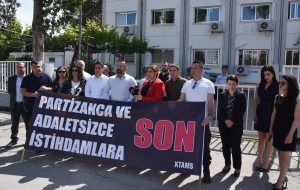Maliye Bakanlığı önünde bir araya gelen KTAMS Yönetim Kurulu, “Partizanca ve Adaletsizce İstihdamlara Son” yazılı pankart açtı.