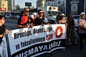 “Hırsızlığa, Adaletsizliğe, Yoksullaşmaya Son, Susmayacağız” ve “Servetleriniz Emeklerimizden Çaldıklarınızdır” ve “Boş Tencerenin Düşüremeyeceği İktidar Yoktur” yazılı pankartlar açılan eylemde, şarkılar da çalındı.
