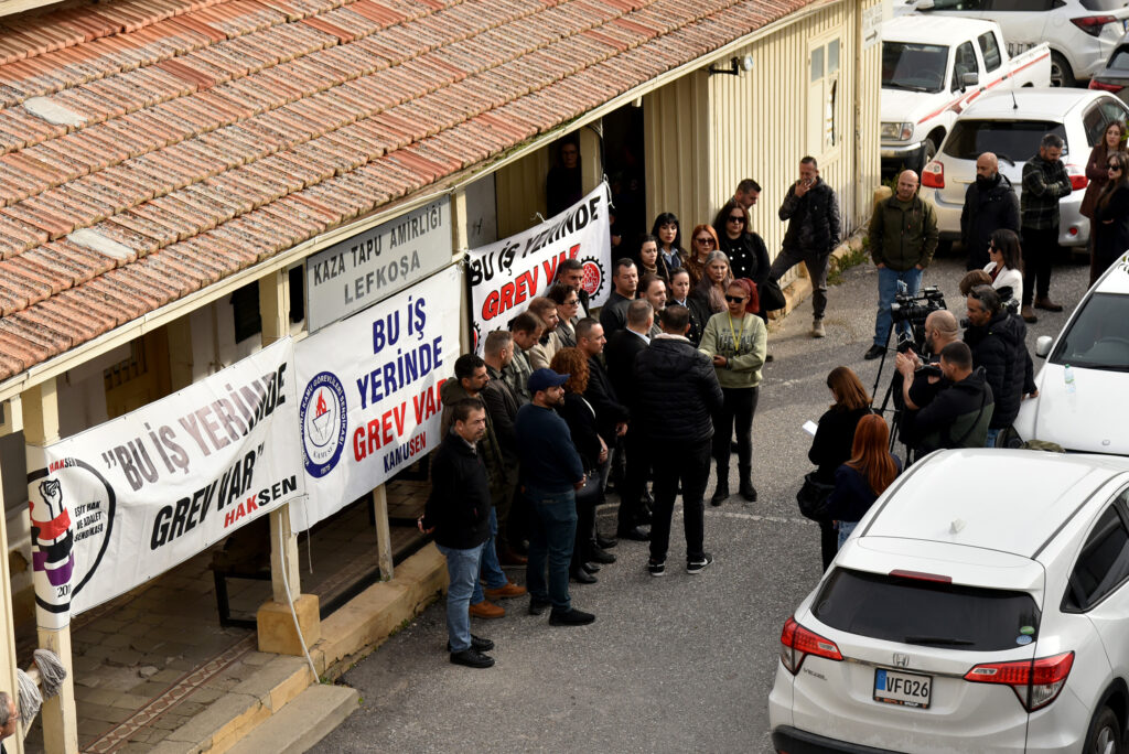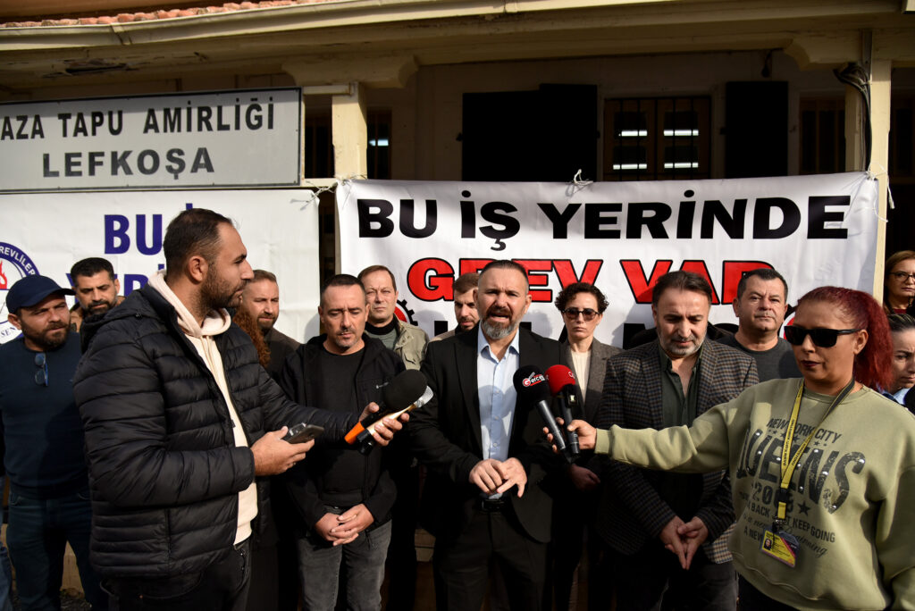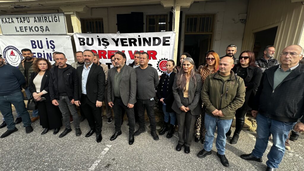 Sendikalar, Lefkoşa Kaza Tapu Amirliği önünde basın açıklaması yaparak, bugün mesai bitimine kadar sorunların çözümüne yönelik adım atılmaması halinde yarın da grev yapacaklarını duyurdu.